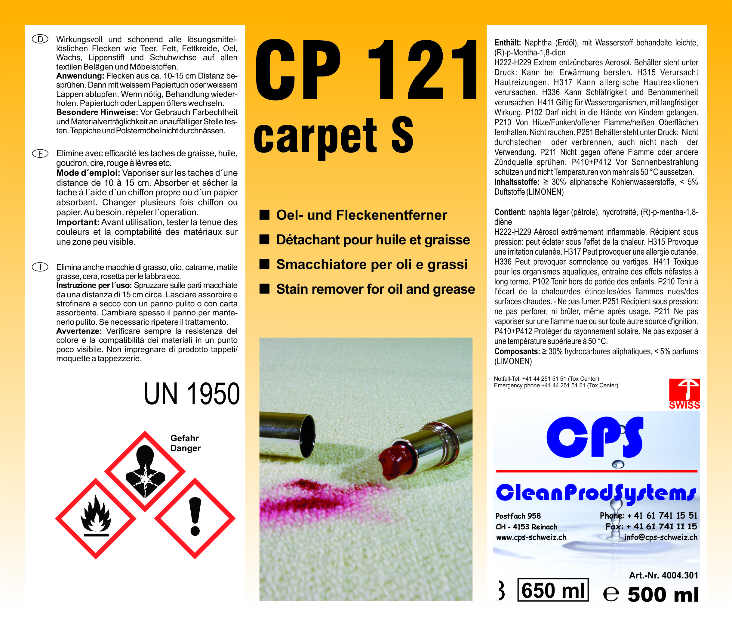 Der Öl und Fleckentferner CP121 Carpet S ist wirkungsvoll und schonend auf alle lösungsmittellösliche Flecken wie Teer, Fett, Fettkreide, Oel, Wachs, Lippenstift, und Schuhcrème auf sämtlichen Belägen und Möbelstoffen.